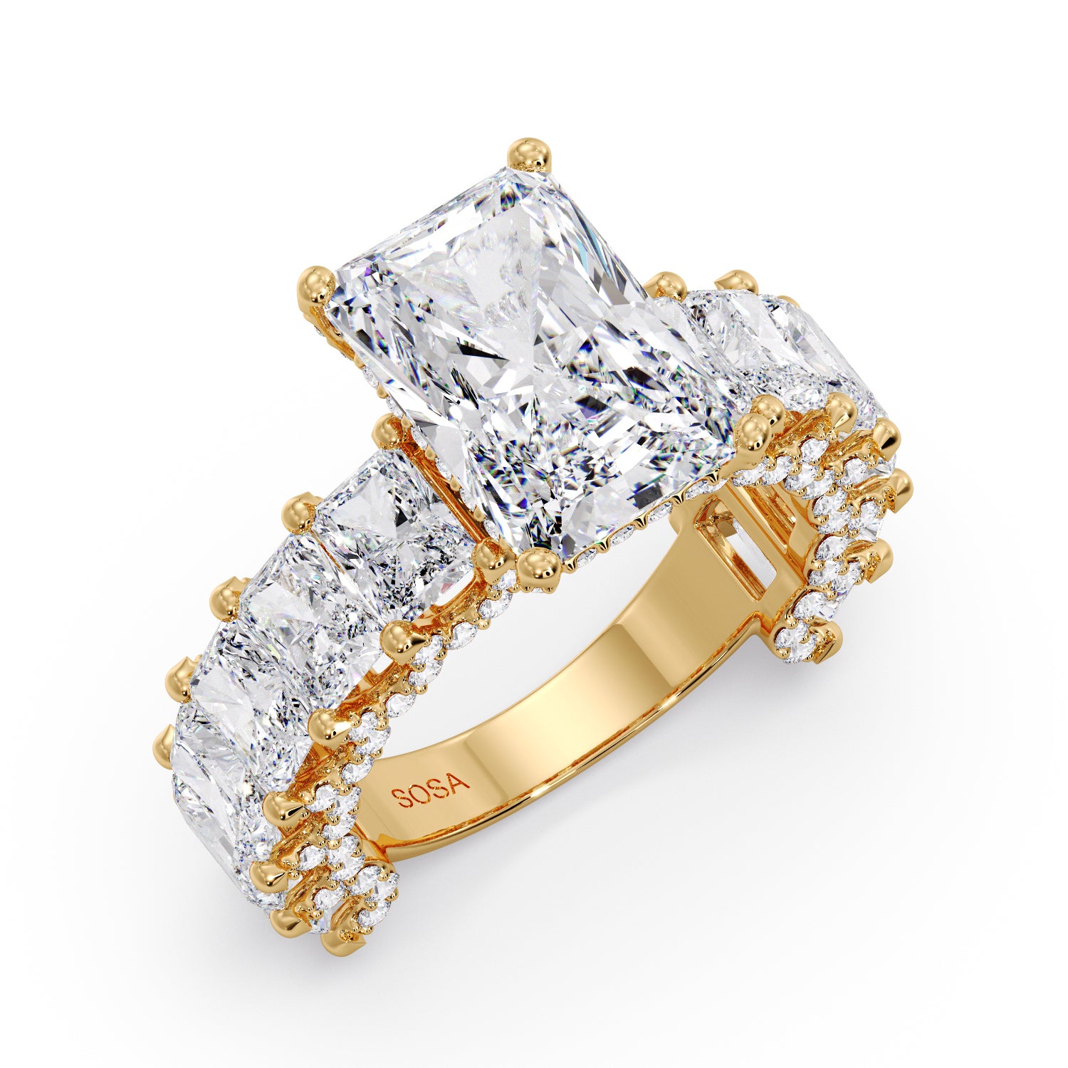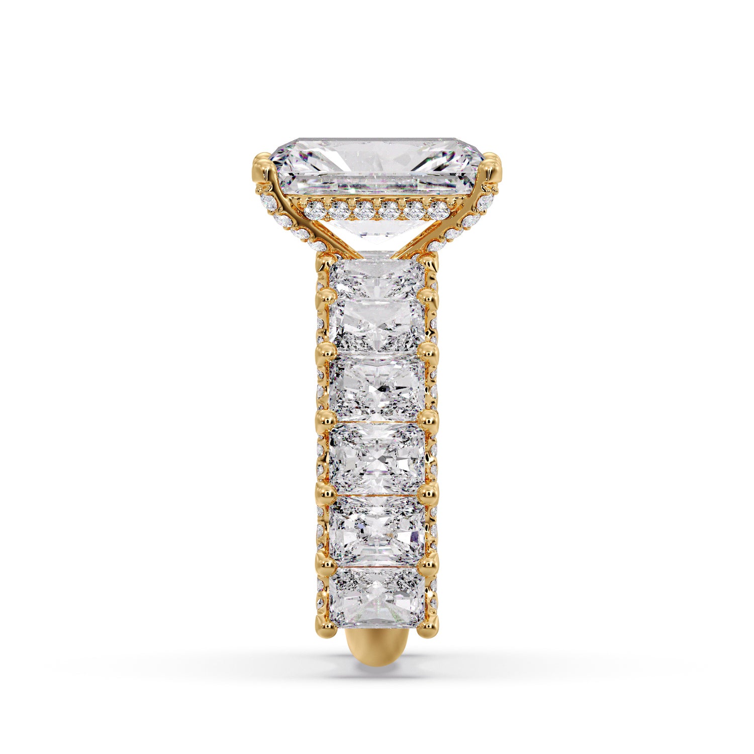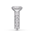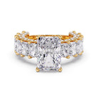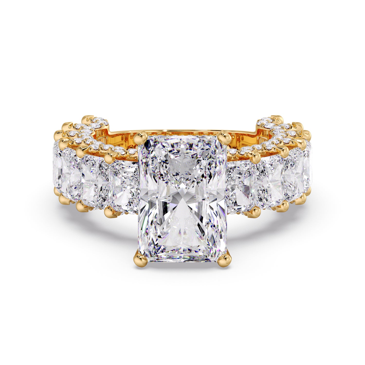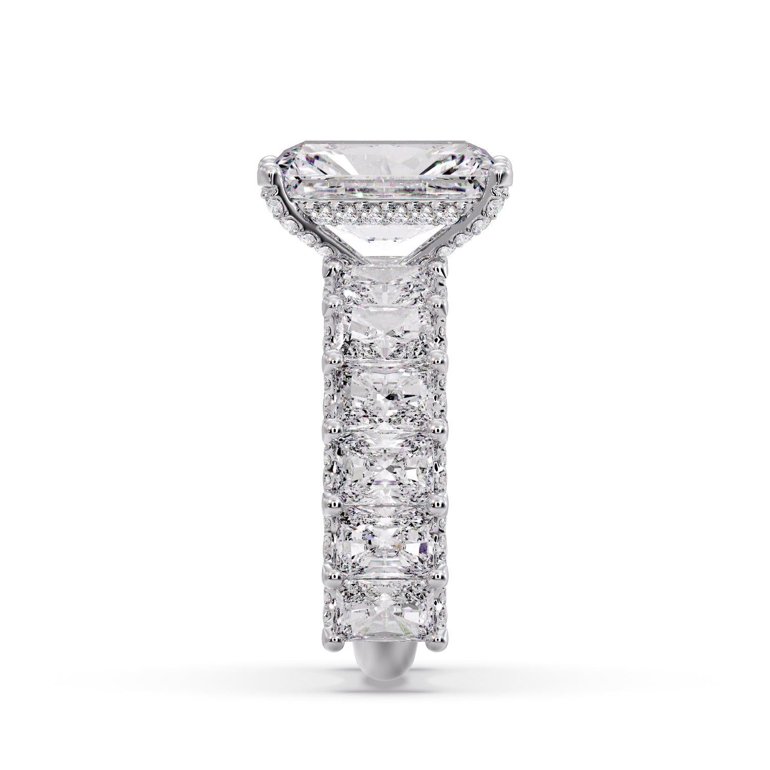 Complemented by 2.40 carats of smaller Radiant diamonds along the band and delicate Round accent diamonds that enhance its sparkle from every angle.