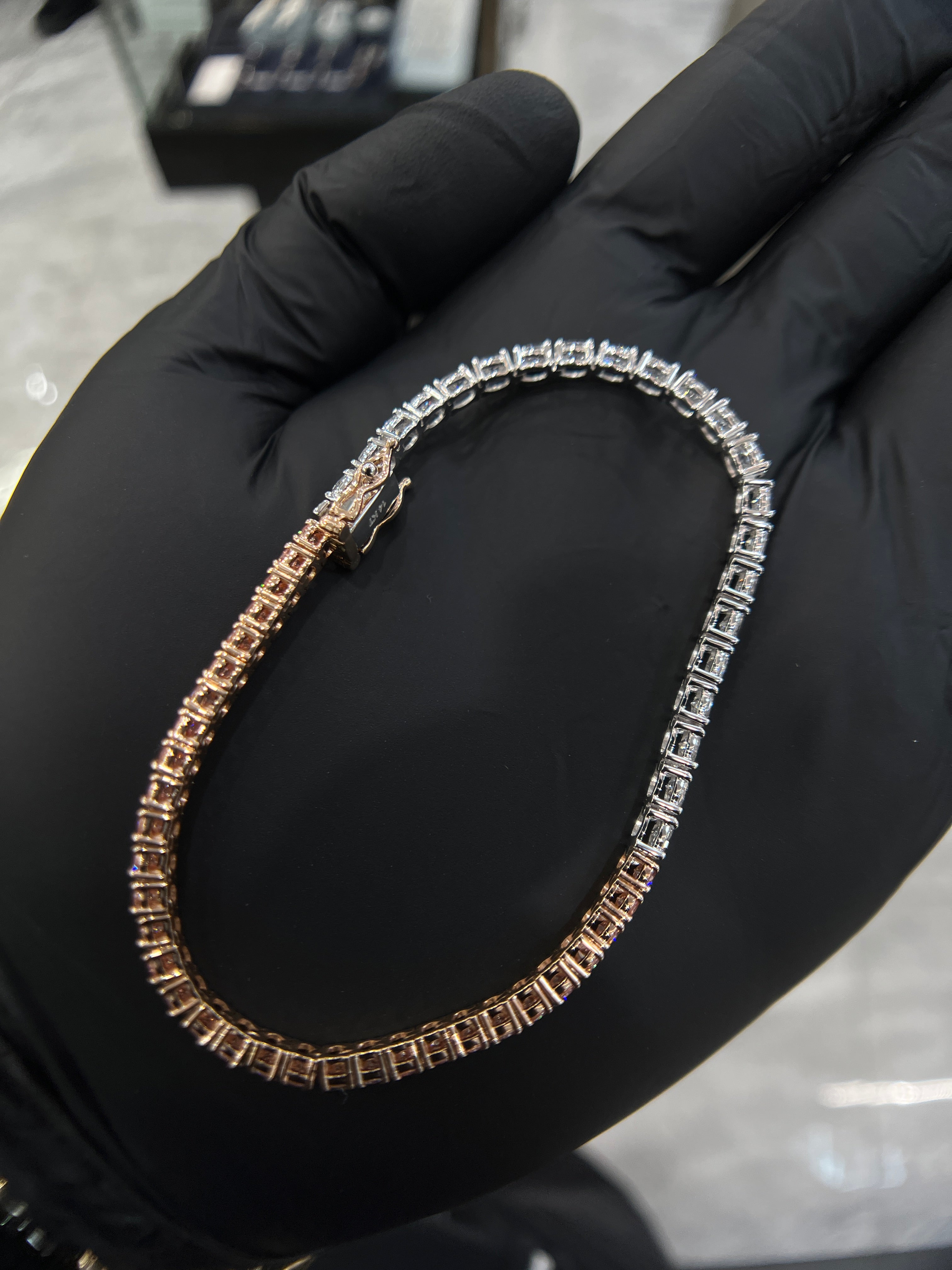 This stunning diamond tennis bracelet features a refined blend of pink and white brilliant round diamonds, expertly set in 14K white and rose gold. Designed for timeless elegance with a modern edge, this piece delivers exceptional sparkle and rare color in a classic silhouette.