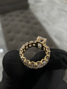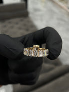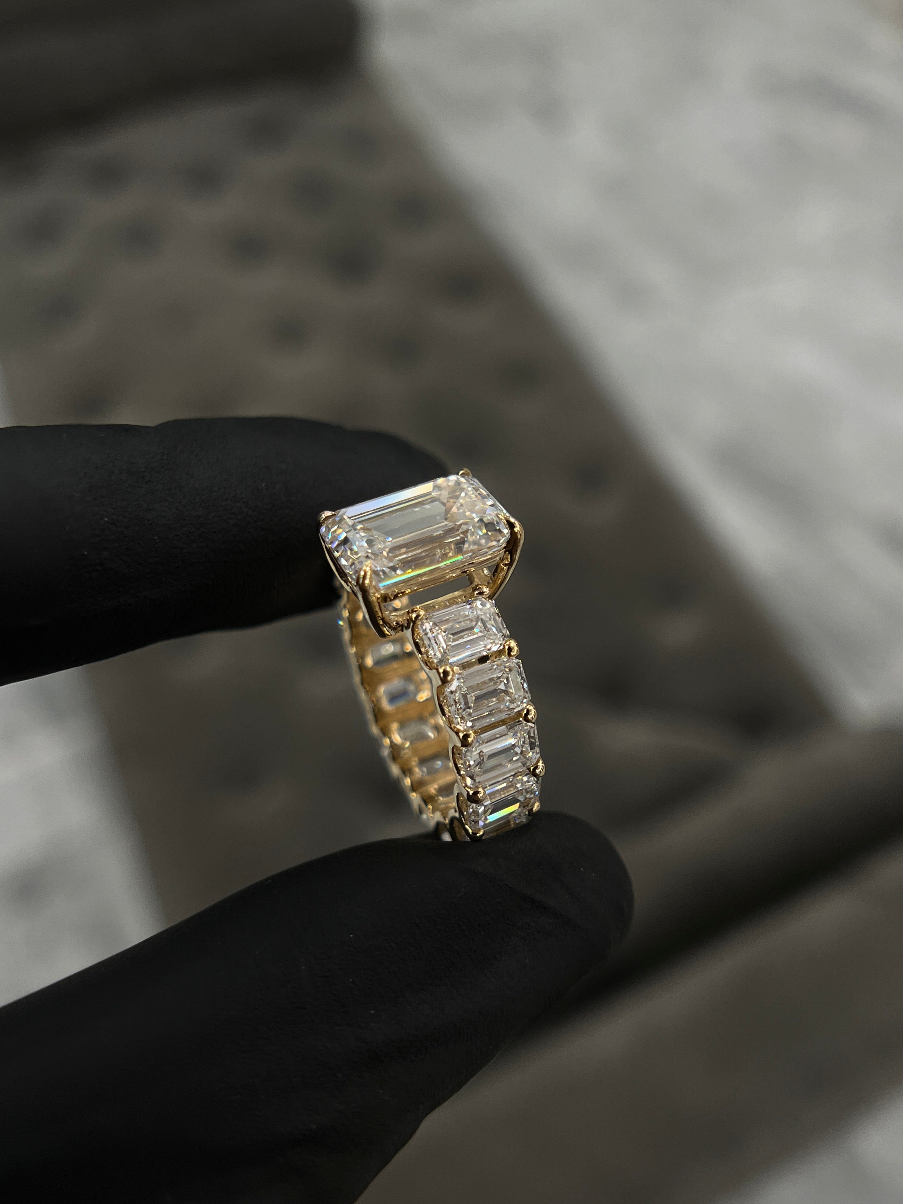 Crafted in 14K gold Either in Yellow gold or white gold, Emeralds going all around the band appx 5-6.8 carats depending on ring size.