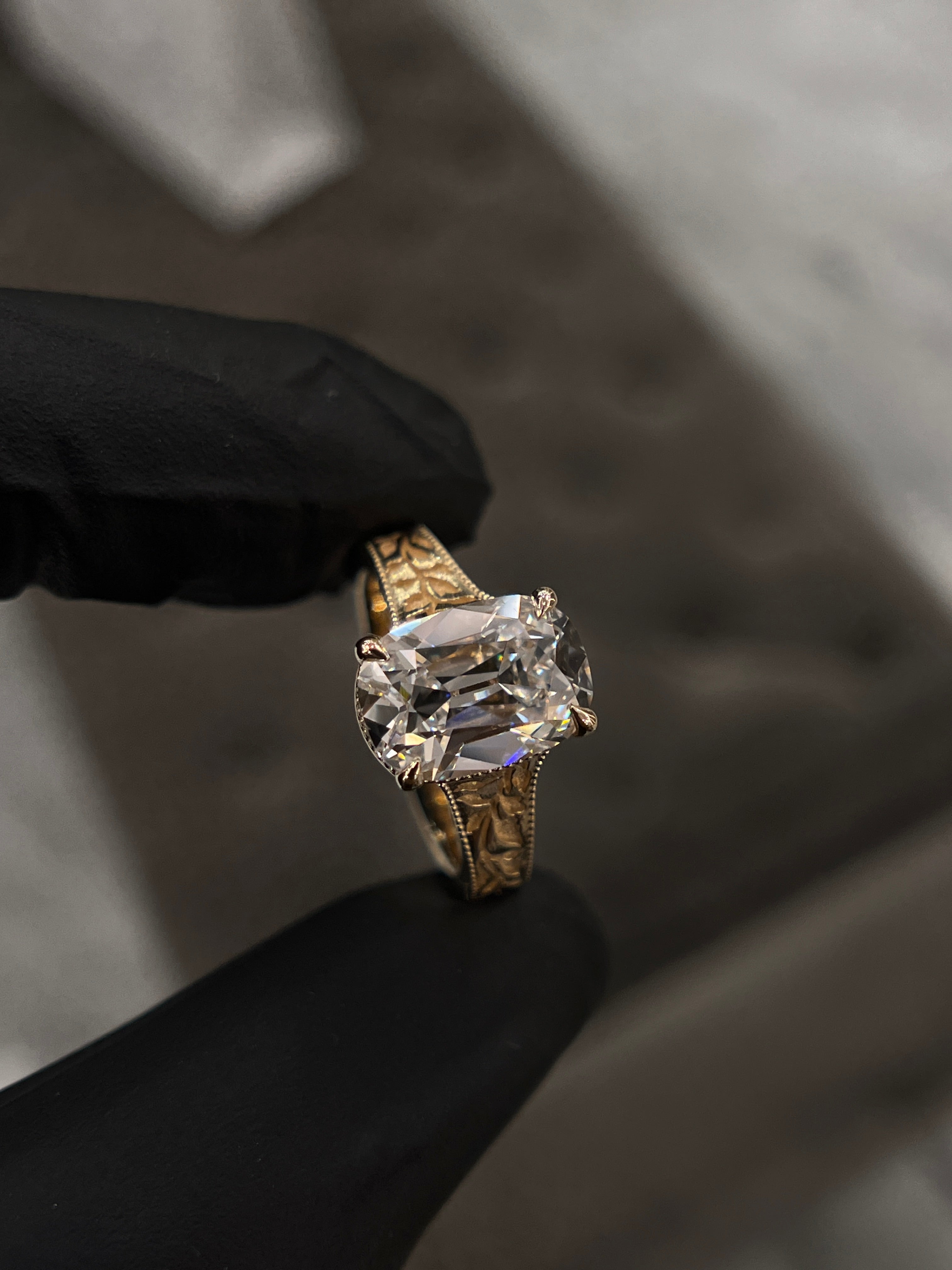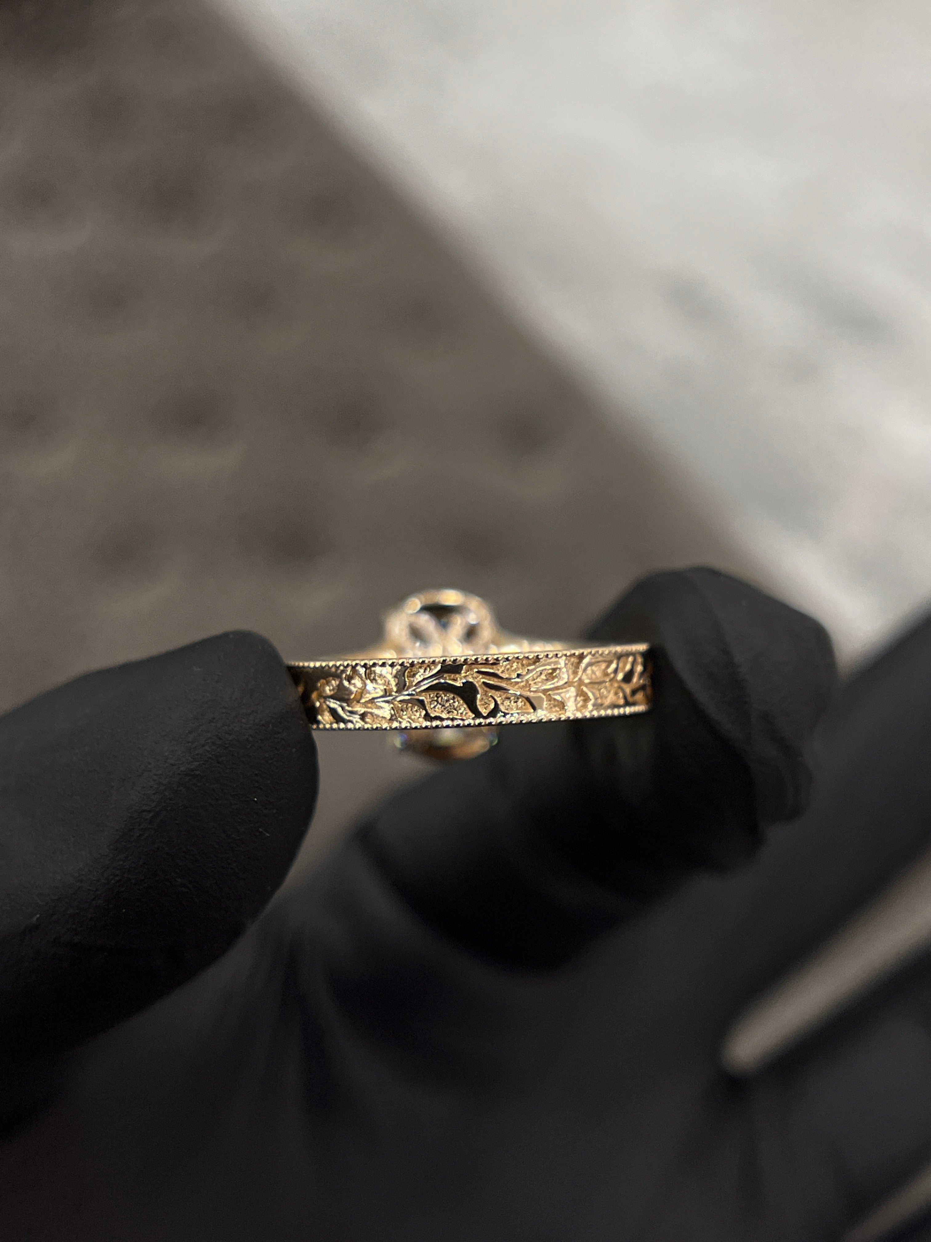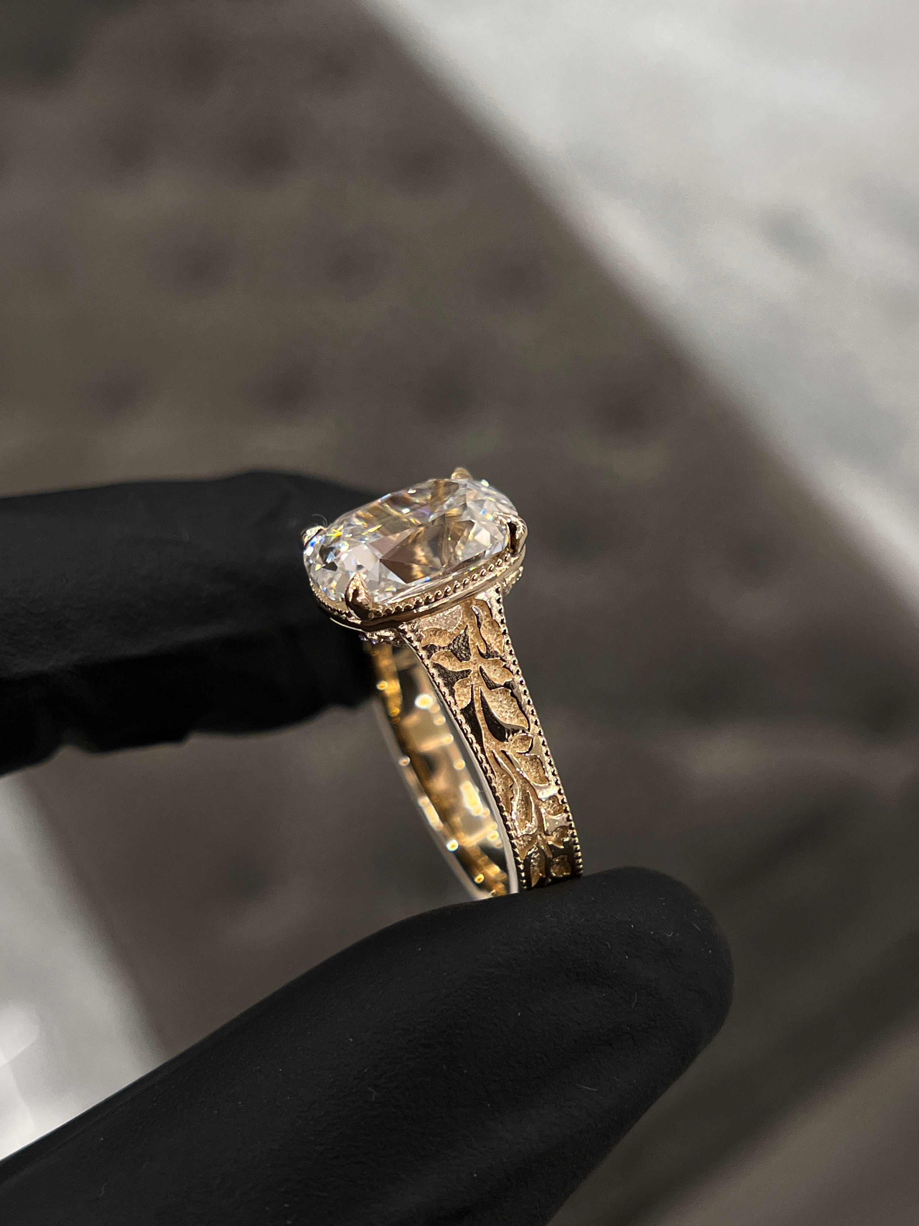 This exquisite ring features an old miner lab grown diamond, Graded VS1 in clarity and D in color, Certified by IGI. Foral-inspired head, elegantly crafted to capture a leaf pattern on band. The ring is made in solid 14 karat gold.