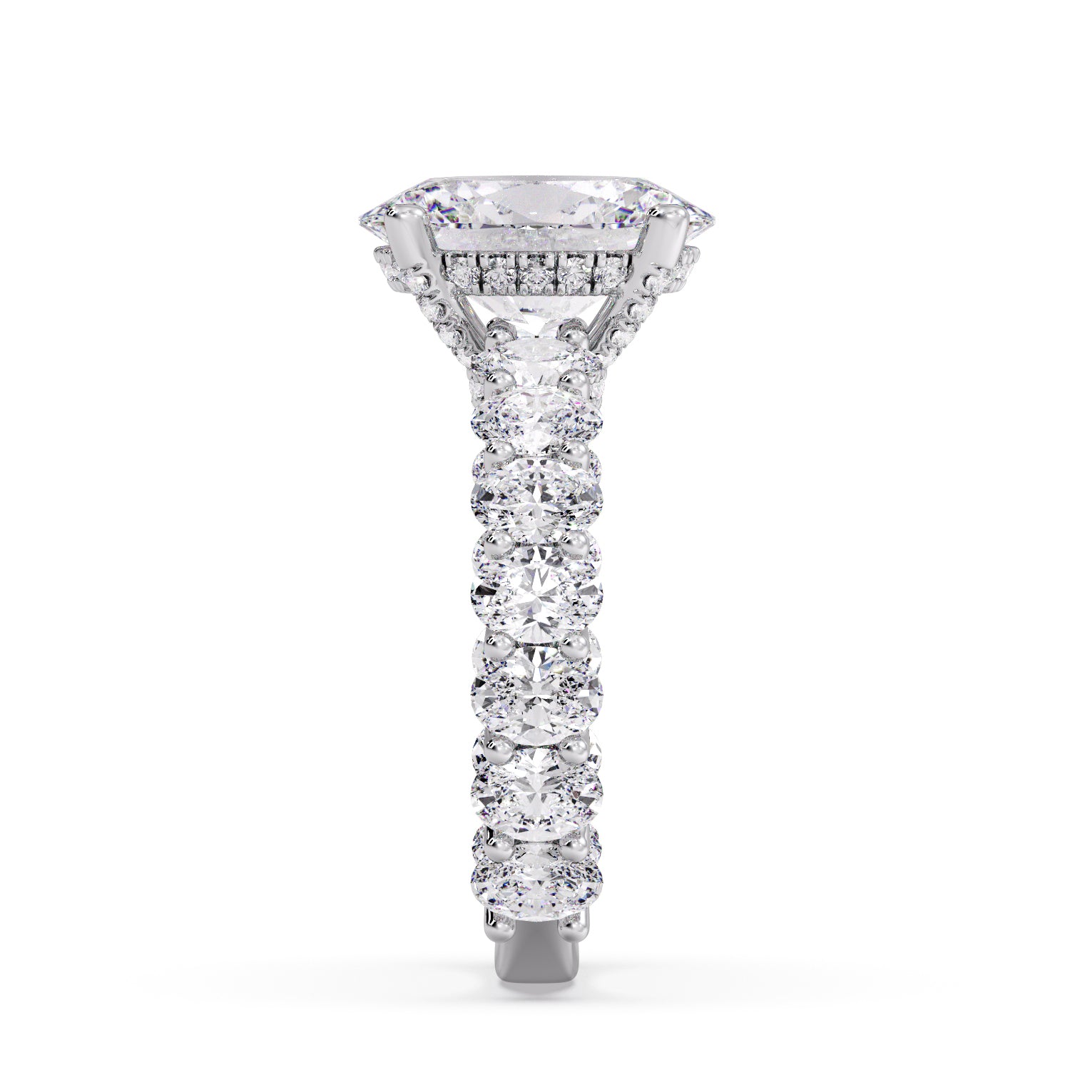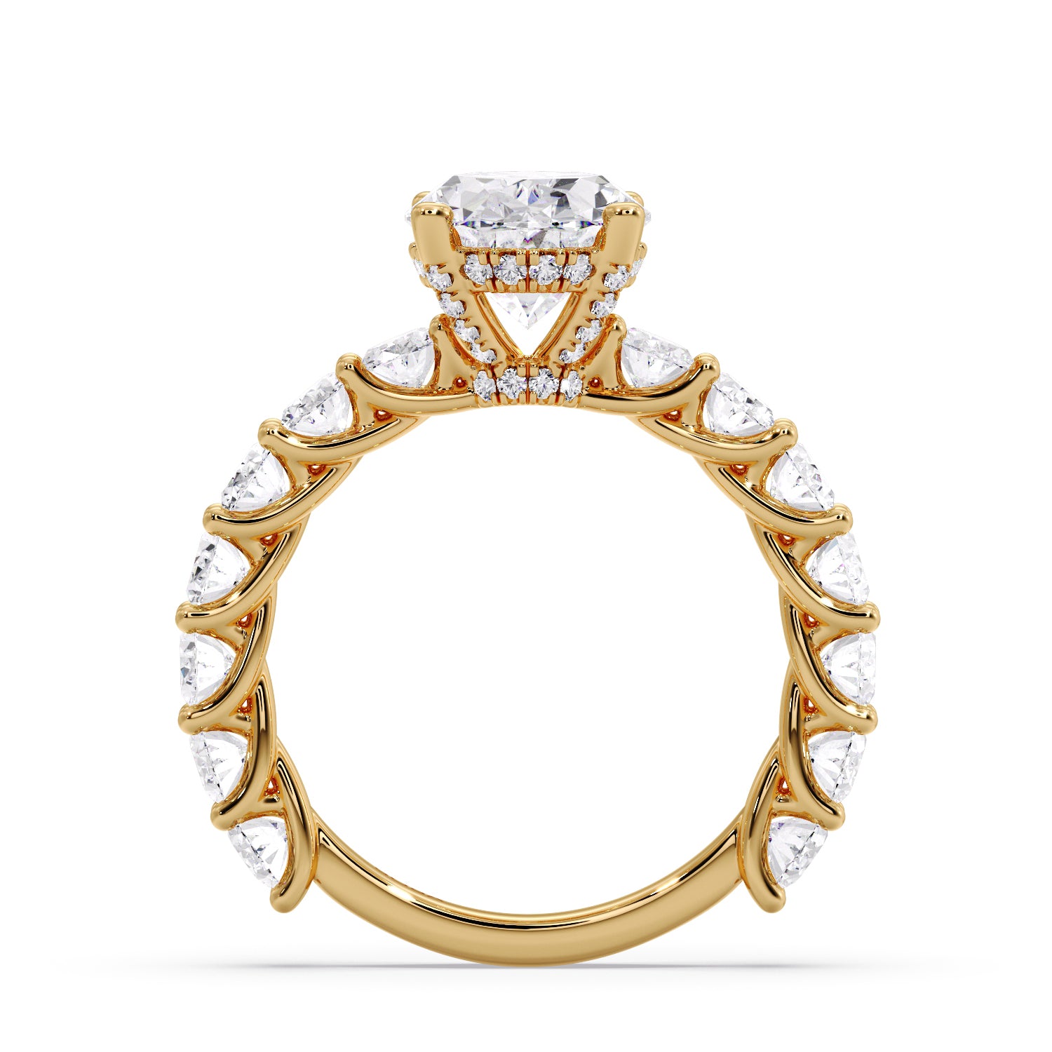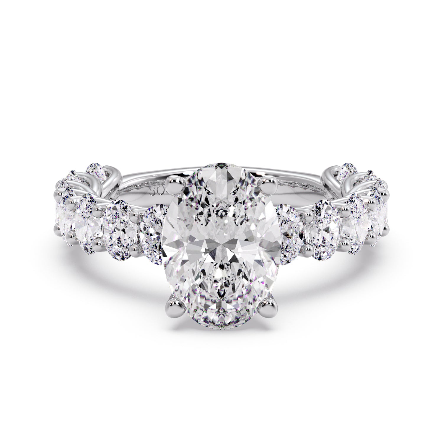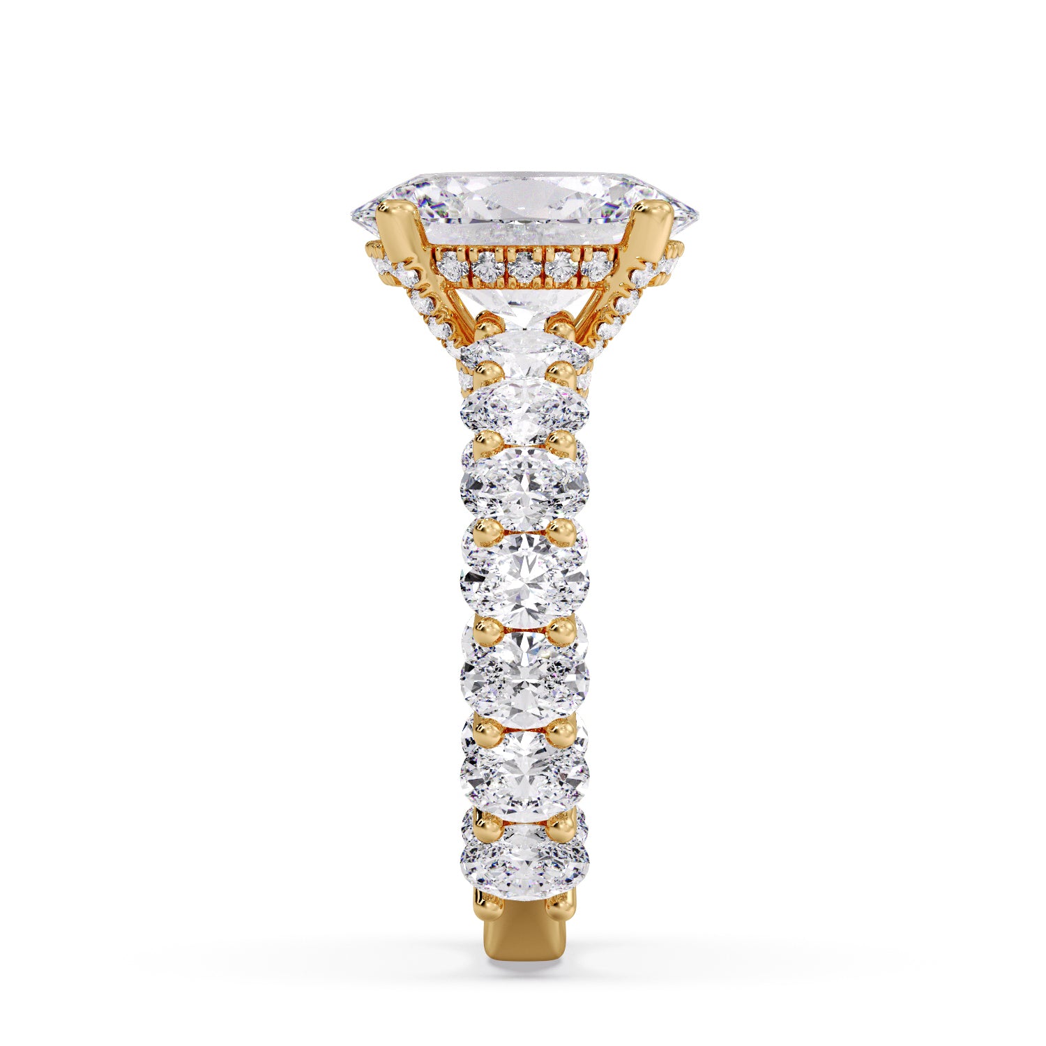 The design is crafted in your choice of 14K Gold (available in Yellow, White, or Rose Gold) and adorned with approximately 2.00 carats of lab-grown diamonds—VS clarity 4x3mm oval diamonds set along the band and round diamonds accenting the hidden halo for added brilliance.