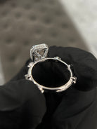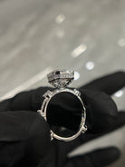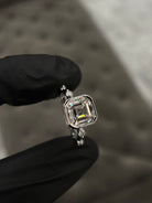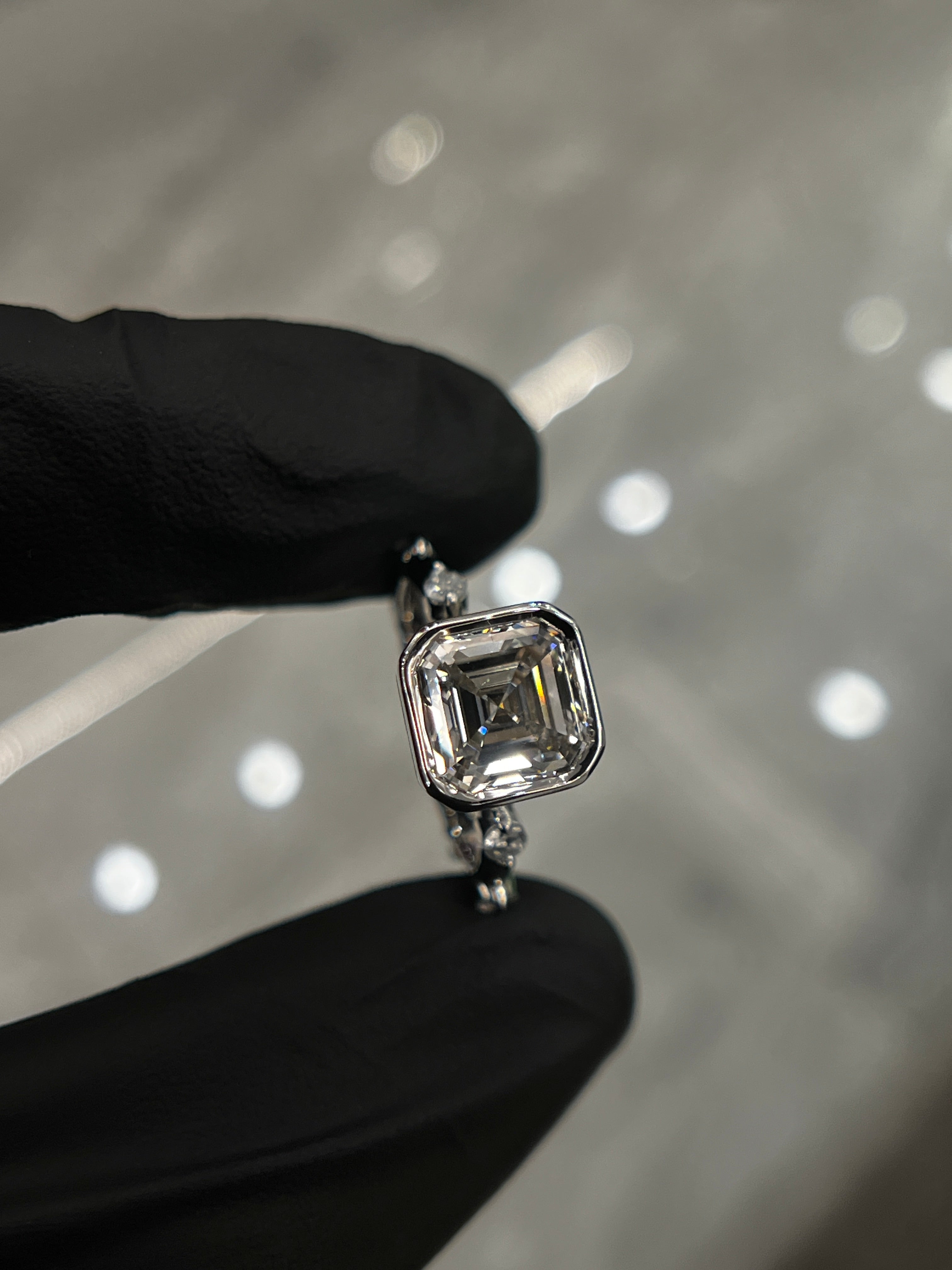 This exquisite ring features an ascher cut lab grown diamond, Graded VS1 in clarity and D in color, Certified by IGI. Center stone set in a bezel setting with 6 round diamonds on band each separated.